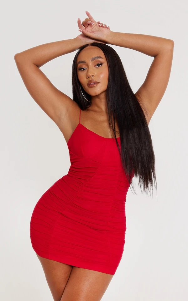 Shape Robe moulante en mesh rouge très froncée à détail bonnets