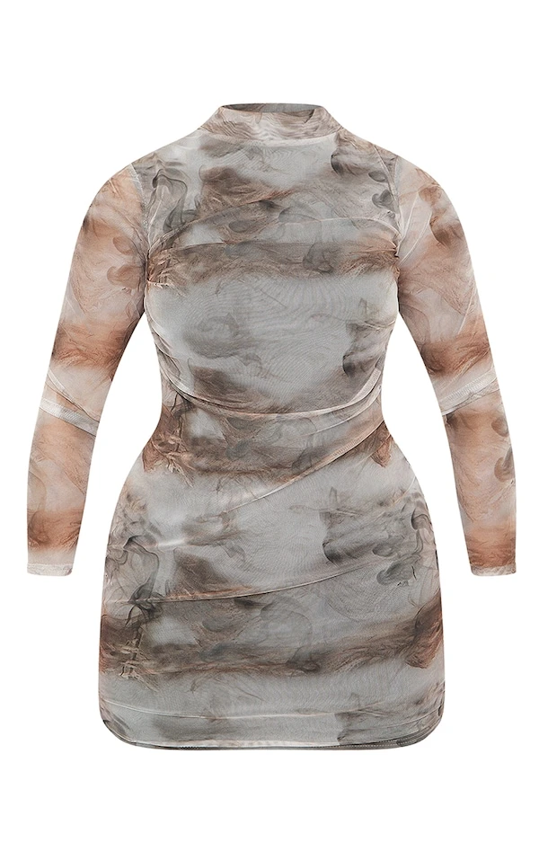 Shape Robe moulante froncée en mesh marron imprimé fumée à col montant