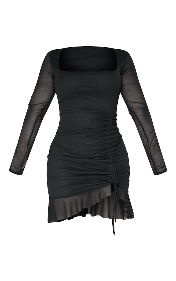Shape Robe moulante froncée en mesh noir à manches longues et volants