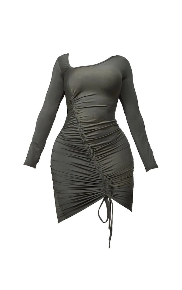 Crush magnifique sur cette robe. On aime beaucoup sa coupe moulante, son coloris kaki moderne et son design à col asymétrique et son style froncé très stylé. C’est à porter avec une paire de talons et quelques bijoux gold. Trop belle !