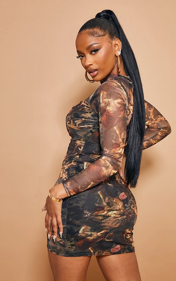 Avis à nos babes les plus arty ! On sait à quel point l’imprimé Renaissance est trendy en ce moment et on l’adore posé sur cette robe moulante avec son coloris marron, sa matière mesh et son col haut. Il ne manque que des talons pour finaliser la tenue !