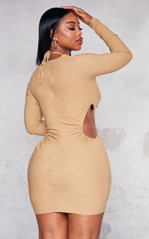Shape Robe moulante tissée camel à buste froncé et découpes