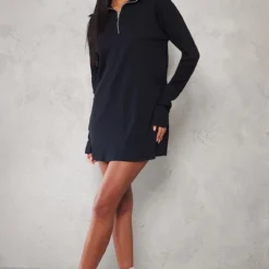 Tall Robe pull oversize noire côtelée à col montant et demi zip