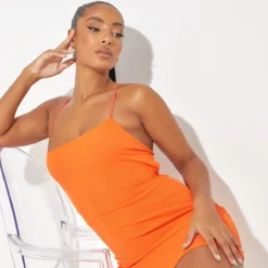 Robe Moulante Orange Satinée Froncée Imprimé Tourbillons à Col Bénitier Plongeant Et Manches Longues