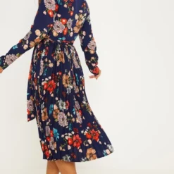 Robe Bleu Marine Florale Mi-longue Plissée à Manches Longues