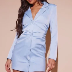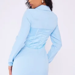 Robe Blazer En Effet Lin Bleu Clair à Corset Satiné Et Manches Longues