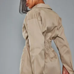 Robe Chemise Gris Pierre Ajustée à La Taille à Manches Longues