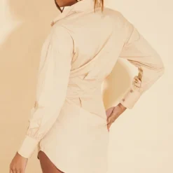 Robe Chemise Froncée Café Au Lait Rosé à Boutons Et Côtés Découpés