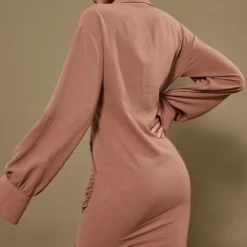 Robe Chemise Tissée Chocolat Texturée Très Décolletée à Manchettes évasées