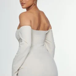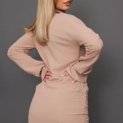 Robe Chemise Tissée Taupe Texturée Très Décolletée à Manchettes évasées