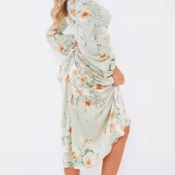 Robe Moulante Torsadée Vert Sauge Imprimé Floral à Buste Effet Drapé