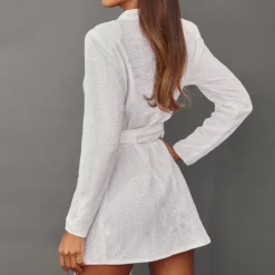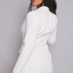 Robe Blazer Satinée Blanche à Dos Découpé Et Franges Strassées