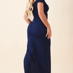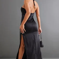 Robe Longue Asymétrique Satinée Froncée Marron Chocolat Fendue
