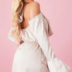 Robe Droite Satinée Plissée Champagne à Col Bardot Et Manches évasées