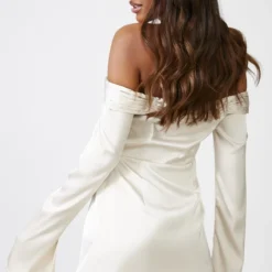 Robe Droite Satinée Crème à Col Bénitier Et épaules Dénudées