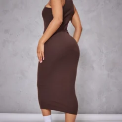 Robe Mi-longue Côtelée Café Au Lait Croisée Devant Fendue Sur Le Côté
