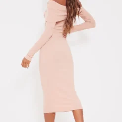Robe Mi-longue En Maille Tricot Côtelée Camel à Manches Longues Et Rabat