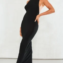 Robe Longue Moulante Noire Découpée à La Taille Sans Manches