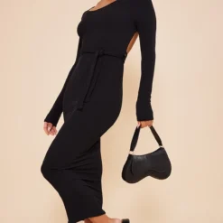 Robe Mi-longue Côtelée Noire à Manches évasées Et Dos Nu Arrondi