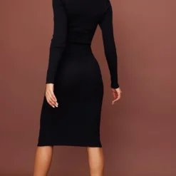 Robe Mi-longue Côtelée Noire à Manches Longues Et Ourlet Légèrement Volanté