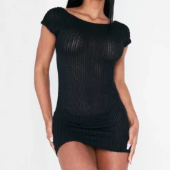 Robe Moulante Dos Nu Noire En Maille Côtelée Texturée à Mancherons