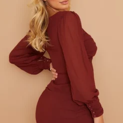 Robe Chemise Plissée Chocolat à Manches Longues Et Liens Multiples