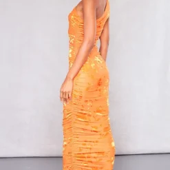 Robe Fendue Longue Texturée Rouille Satinée à Bonnets Plissés Et Bretelles