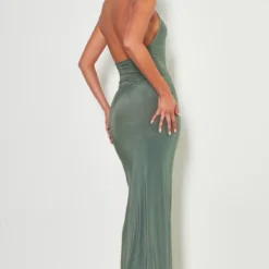 Robe Longue Moulante Vert Olive Découpée Sur Les Côtés à Bretelles Et Col Bénitier