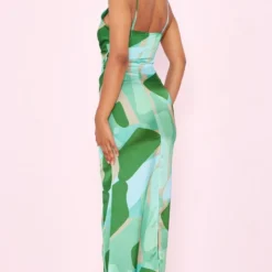 Robe Longue Imprimée Abstrait Vert à Bretelles Et Détail Buste