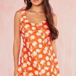 Robe Droite Col Carré Et Manches Bouffantes Rouge à Petites Fleurs