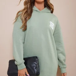 Robe Pull Oversize Sauge Doublure En Polaire à Capuche Et Slogan Cool Girl