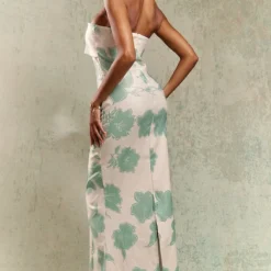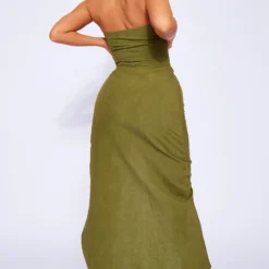 Robe Bustier Longue Vert Olive Satinée Découpée Sur Les Côtés