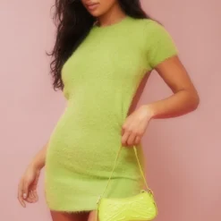 Mini Robe En Maille Duveteuse Vert Citron Ouverte Dans Le Dos