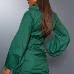 Robe Chemise Moulante Décolletée Vert Forêt Froncée à Manchettes Nouées