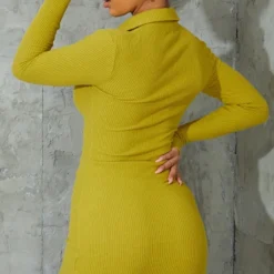 Robe Chemise Froncée Côtelée Douce Chartreuse à Manches Longues