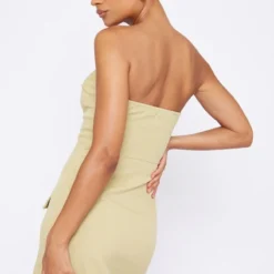 Robe Bustier Moulante Plissée Kaki Clair Satiné à Découpes Et Noeud