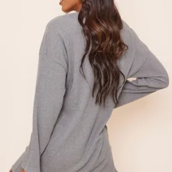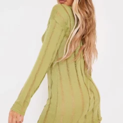 Robe Droite Texturée Vert Olive Déchirée à Manches Longues Oversize