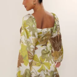 Robe Longue Asymétrique Vert Foncé Imprimé Abstrait à Découpes Et Dos Nu