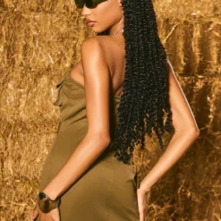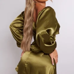 Robe Droite Satinée Plissée Kaki à Col Bardot Et Manches évasées